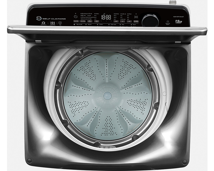 - Máy giặt Aqua Inverter 15 kg AQW-DR150UGT(PS) sở hữu thiết kế cửa trên gọn gàng, chắc chắn với gam màu trung tính dễ bố trí trong nhiều không gian giặt giũ. Nắp kính chịu lực giảm chấn giúp đóng mở êm ái, an toàn khi sử dụng, đặc biệt phù hợp với gia đình có trẻ nhỏ. Bảng điều khiển tiếng Việt kết hợp núm xoay quen thuộc, đặt phía sau giúp thao tác thuận tiện và hạn chế mỏi cổ.