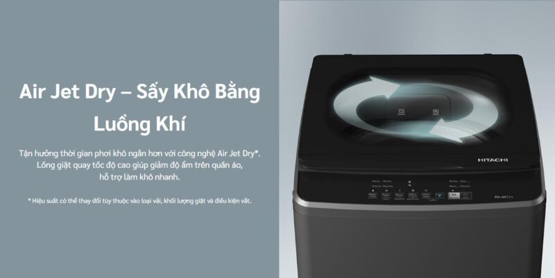 - Các chương trình giặt nhanh là điểm mạnh của máy giặt Hitachi Inverter 10 kg LTL 10MV00(GG) này, đáp ứng tốt nhu cầu giặt hàng ngày một cách hiệu quả. Chế độ giặt nhanh chỉ mất khoảng 19 phút để hoàn thành với lượng đồ ít, trong khi giặt nửa tải mất khoảng 28 phút, giúp bạn linh hoạt hơn trong việc lựa chọn chương trình phù hợp. Công nghệ Air Jet Dry giúp vắt khô quần áo nhanh hơn bằng luồng khí tốc độ cao kết hợp với lực quay mạnh, rút ngắn thời gian phơi đồ, đặc biệt hữu ích trong những ngày mưa.