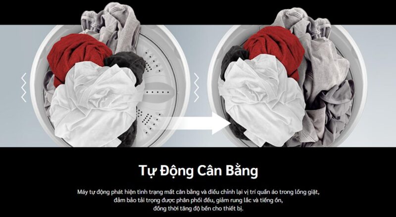 Máy sở hữu nhiều chương trình giặt nhanh, đáp ứng tốt nhu cầu giặt giũ hằng ngày. Chế độ giặt nhanh chỉ mất khoảng 19 phút cho lượng đồ ít, trong khi chế độ giặt nửa tải hoàn tất trong khoảng 28 phút, rất phù hợp với gia đình bận rộn. Công nghệ Air Jet Dry sử dụng luồng khí tốc độ cao kết hợp với lực quay mạnh giúp quần áo được vắt khô hơn, rút ngắn đáng kể thời gian phơi. Ngoài ra, máy còn có các chế độ ngâm chuyên sâu như ngâm xử lý vết bẩn để làm mềm các vết bẩn cứng đầu và ngâm nước xả giúp hương thơm thấm sâu, lưu lại lâu trên sợi vải.