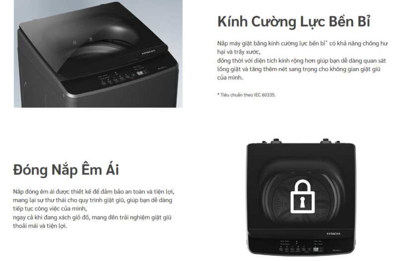 Máy giặt Hitachi LTL 10MV00(GG) được trang bị nắp đóng êm Soft Closing, giúp nắp hạ xuống nhẹ nhàng, không gây tiếng ồn và tránh kẹp tay, rất an toàn cho gia đình có trẻ nhỏ. Nắp kính cường lực bền bỉ, chịu lực tốt và chống trầy xước, đồng thời mang lại vẻ ngoài hiện đại, sang trọng. Khóa nắp an toàn đảm bảo nắp luôn được khóa chặt trong suốt quá trình vận hành, ngăn ngừa các rủi ro không mong muốn. Ngăn chứa nước giặt và nước xả được thiết kế tích hợp, dễ thao tác và giúp người dùng định lượng chính xác hơn khi sử dụng.