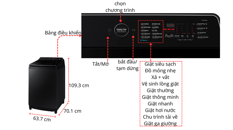 - Bảng điều khiển AI Control thông minh: Ghi nhớ thói quen sử dụng và tự động đề xuất chế độ giặt phù hợp, với giao diện song ngữ Anh – Việt, nút nhấn + màn hình hiển thị dễ thao tác.