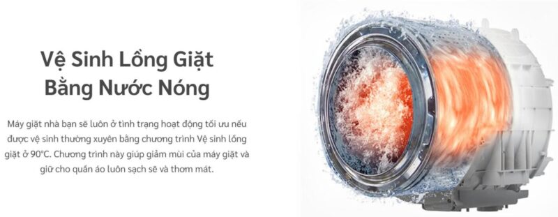 Chương trình vệ sinh lồng giặt bằng nước nóng giúp loại bỏ cặn bẩn và mùi hôi tích tụ bên trong lồng máy. Việc vệ sinh định kỳ giúp máy luôn hoạt động ổn định và kéo dài tuổi thọ. Đồng thời, quần áo được giặt trong môi trường sạch hơn, hạn chế vi khuẩn và nấm mốc.