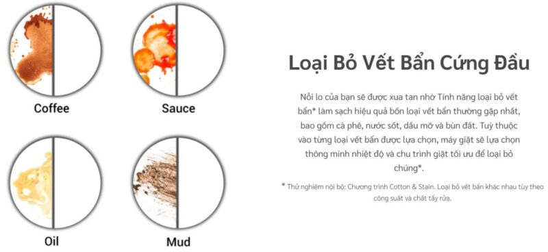 Máy được thiết kế để xử lý hiệu quả các vết bẩn thường gặp như cà phê, nước sốt, dầu mỡ hay bùn đất. Tùy theo loại vết bẩn được lựa chọn, máy sẽ tự động điều chỉnh nhiệt độ và chu trình giặt phù hợp. Điều này giúp nâng cao hiệu quả giặt sạch mà vẫn bảo vệ sợi vải.