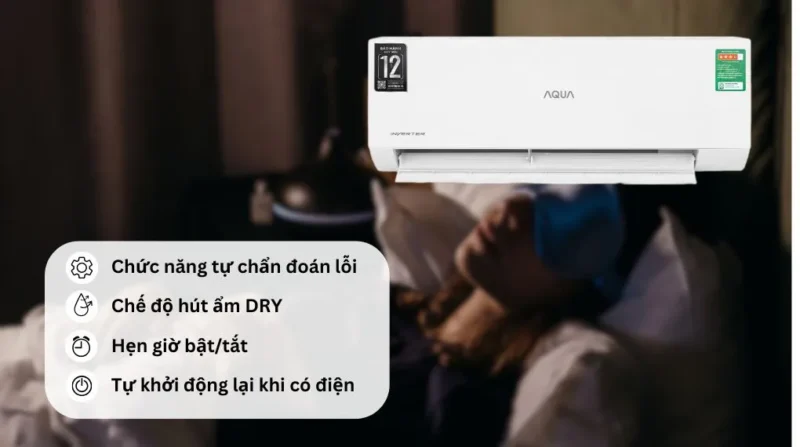 - Máy lạnh Aqua AQA-RV13QA3 còn được tích hợp nhiều tiện ích như tự làm sạch dàn lạnh Self Clean, Sleep Mode, hẹn giờ bật tắt và tự khởi động lại khi có điện. Màn hình hiển thị nhiệt độ trên dàn lạnh giúp người dùng dễ theo dõi trạng thái hoạt động. Nhìn chung, đây là lựa chọn cân bằng giữa hiệu năng, tiện ích và khả năng tiết kiệm điện.