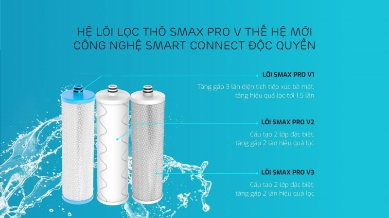 - Hệ lõi lọc thô Smax Pro V: 3 lõi thô độc quyền, tăng gấp 3 diện tích tiếp xúc với nước, gấp 2 hiệu quả lọc, công nghệ Smart Connect giúp vận hành ổn định và tăng tuổi thọ lõi lọc.