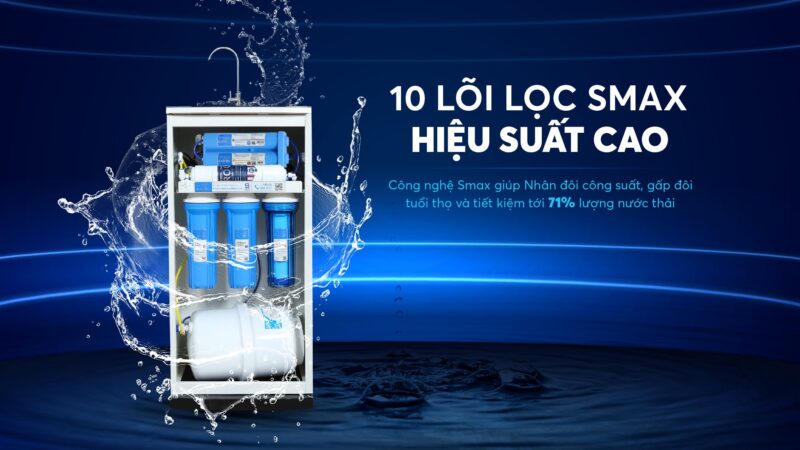 - Máy được trang bị hệ thống 10 lõi lọc công nghệ Smax tiên tiến, hiệu suất lọc được nhân đôi và tuổi thọ lõi gấp đôi, đồng thời giúp tiết kiệm đến 71% lượng nước thải so với máy RO thông thường.