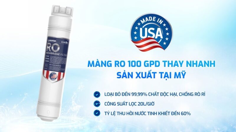 - Màng lọc: RO Purifim 100 GPD (Mỹ), thay nhanh