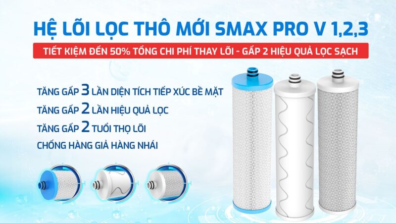 - Bộ 3 lõi thô Smax Pro V: tăng 3 lần diện tích tiếp xúc, gấp 2 hiệu quả lọc.