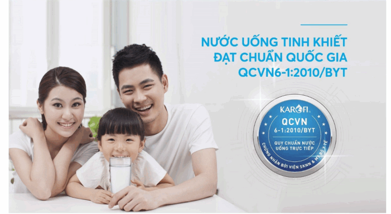 - Đầu ra đạt QCVN 6-1:2010/BYT (nước tinh khiết uống ngay), đồng thời tuân thủ tiêu chuẩn TCVN 11978:2017 cho thiết bị lọc gia đình — bảo đảm cả chất lượng nước và an toàn sử dụng.