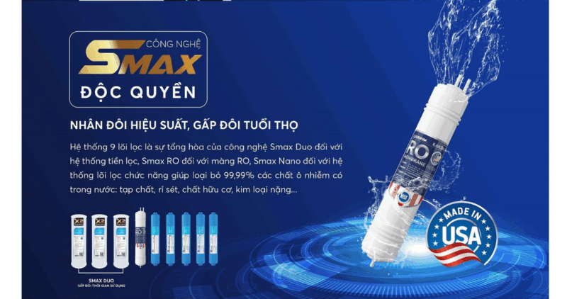 - Công nghệ Smax Duo, Smax RO, Smax Nano tích hợp trong hệ 9 lõi lọc giúp tăng gấp đôi công suất lọc (20 L/giờ), tuổi thọ lõi dài hơn, đồng thời giảm đến 75% nước thải so với máy RO thông thường.