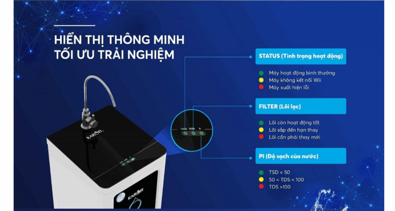 - Màn hình hiện thị chất lượng nước rõ ràng — bạn luôn biết nước mình dùng có đạt chuẩn hay không.