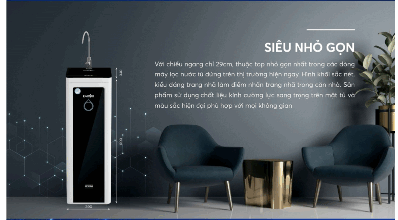 - Kích thước nhỏ gọn (290 x 340 x 900 mm) và trọng lượng chỉ 26 kg dễ lắp đặt ở bếp, phòng khách hay văn phòng.