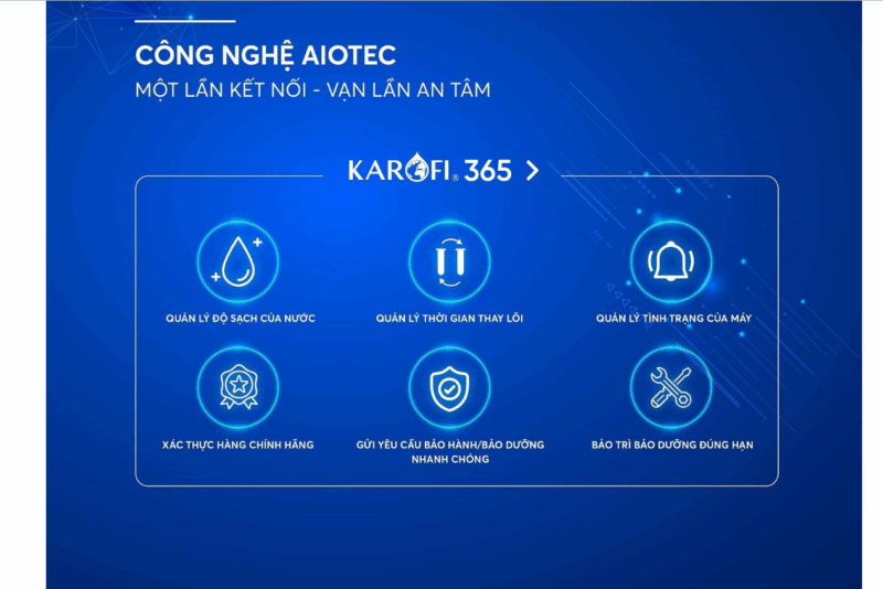 - Công nghệ: AioTec – theo dõi hoạt động, cảnh báo lỗi và giám sát chất lượng nước qua app Karofi 365
