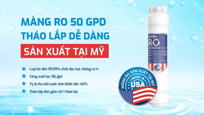 - Màng RO Purifim 50 GPD (sản xuất tại Mỹ), công suất lọc 10 lít/giờ, tỷ lệ thu hồi nước tinh khiết đạt đến 40%.