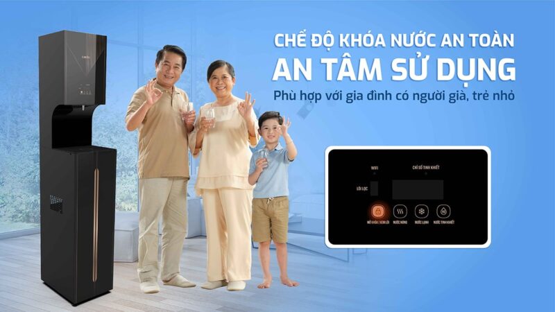 - Thiết kế sang trọng và tiện ích: Máy có mặt kính tràn viền, gam màu đen sang trọng, tích hợp khoang chứa đồ, vị trí lấy nước ngang tầm tay và bánh xe di chuyển tiện lợi. Khóa nước nóng an toàn giúp bảo vệ gia đình có trẻ nhỏ và người cao tuổi.