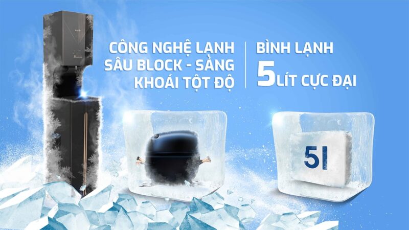 Ứng dụng công nghệ làm lạnh Block (giống tủ lạnh), cho khả năng làm lạnh sâu hơn so với làm lạnh điện tử. Nhiệt độ nước duy trì ở mức 8–10°C. Bình lạnh dung tích 5 lít – gấp đôi nhiều model khác, đáp ứng nhu cầu nước mát cho cả gia đình hoặc nhóm người tại văn phòng.