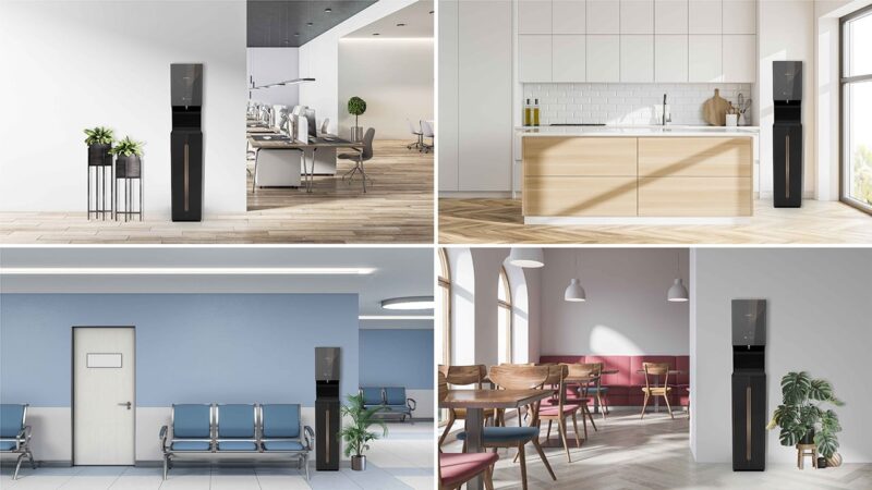 Mặt kính tràn viền cao cấp, gam màu đen hiện đại phù hợp nhiều không gian (gia đình, văn phòng, spa, showroom). Vị trí lấy nước ngang tầm tay, hạn chế cúi người. Khoang chứa đồ ẩn giúp cất ly cốc gọn gàng. Bánh xe dưới chân tủ hỗ trợ di chuyển dễ dàng.
