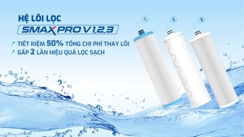 - 12 lõi lọc Smax thế hệ mới: Gấp đôi công suất, gấp đôi tuổi thọ, bổ sung thêm lõi Nano Hydro-ion 4 trong 1 (Hydrogen, ion kiềm, khoáng chất, kháng khuẩn).