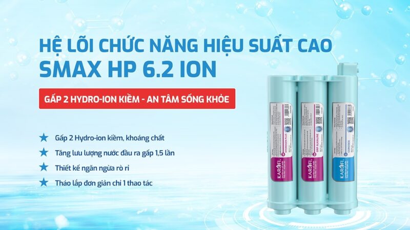 - Hệ lõi chức năng HP 6.2 ion và lõi Hydro-ion kiềm bổ sung vi khoáng, Hydrogen và ion kiềm, hỗ trợ cân bằng pH và chống oxy hóa.