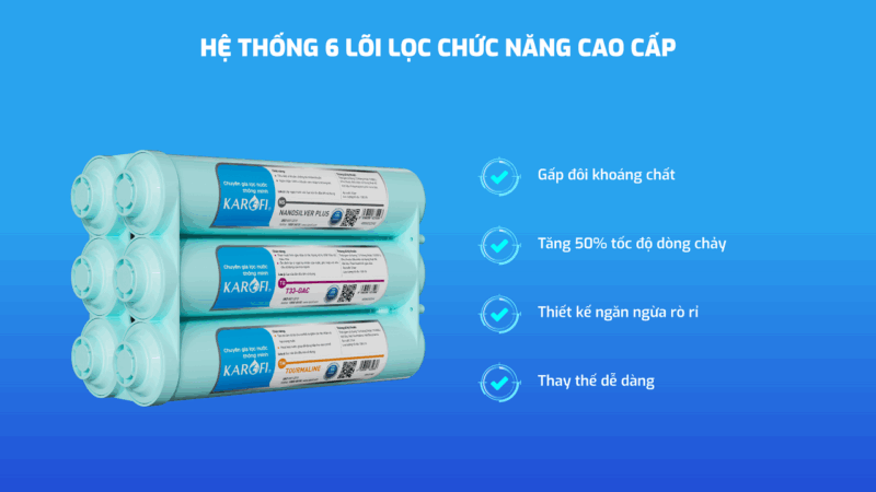 - Máy lọc nước Karofi KAQ-U65 được trang bị 10 lõi lọc công nghệ Smax thế hệ mới, cho hiệu suất lọc và tuổi thọ gấp đôi so với các máy lọc thông thường. Hệ thống này giúp tăng khả năng loại bỏ tạp chất, kim loại nặng, vi khuẩn, virus và các chất gây ô nhiễm, đồng thời duy trì hiệu quả ổn định trong thời gian dài.