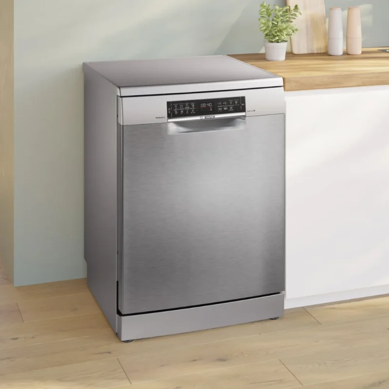 - Máy còn ghi điểm nhờ tính năng thông minh như kết nối Home Connect cho phép điều khiển từ xa, chế độ SpeedPerfect Plus rút ngắn thời gian rửa, và chương trình Extra Silence hỗ trợ giảm tiếng ồn khi cần thiết. Bên cạnh đó, 8 chương trình rửa đa dạng giúp người dùng dễ dàng lựa chọn chế độ phù hợp cho từng loại bát đĩa, từ ly thủy tinh mỏng manh đến xoong nồi bám bẩn nặng.