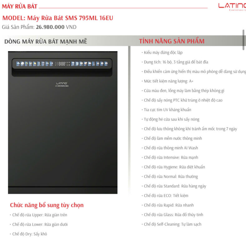 MÁY RỬA BÁT LATINO SMS 795ML 16EU