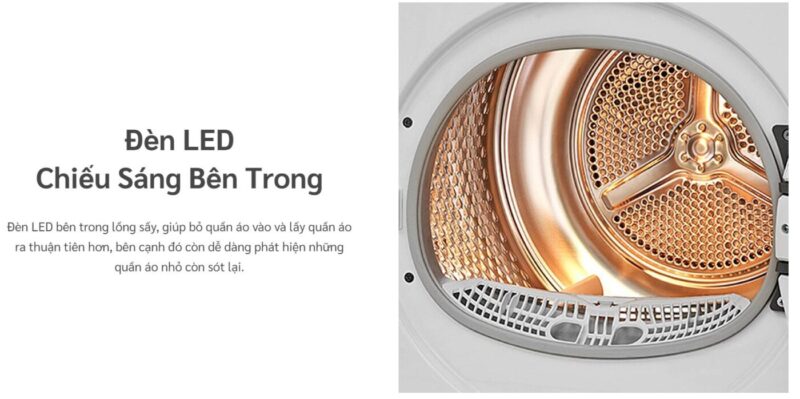 Lồng sấy của máy được trang bị đèn LED chiếu sáng bên trong, giúp người dùng dễ dàng quan sát khi cho hoặc lấy quần áo. Nhờ ánh sáng rõ ràng, bạn có thể nhanh chóng phát hiện những món đồ nhỏ còn sót lại trong lồng. Tính năng này đặc biệt hữu ích khi sử dụng máy vào buổi tối hoặc trong không gian thiếu sáng. Sự tiện lợi nhỏ nhưng mang lại trải nghiệm sử dụng cao cấp hơn.