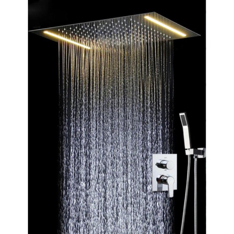- Một trong những điểm nổi bật nhất của KAFF KF-HI16032A là bát sen vuông gắn trần kích thước lớn 300 x 300 mm, tích hợp đèn LED đổi màu và phát nhạc. Thiết kế này giúp người dùng thư giãn tối đa khi tắm, biến không gian tắm trở thành nơi tận hưởng và giải tỏa căng thẳng sau ngày dài.