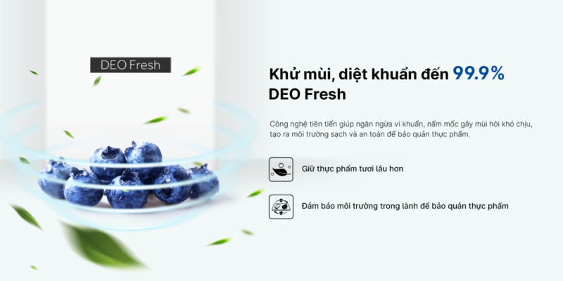 Công nghệ DEO Fresh với phân tử Nano bạc giúp hạn chế vi khuẩn gây hại bên trong tủ lạnh. Đồng thời, mùi hôi khó chịu được loại bỏ hiệu quả, giữ không gian tủ luôn trong lành. Thực phẩm được bảo quản an toàn và không bị ám mùi lẫn nhau.
