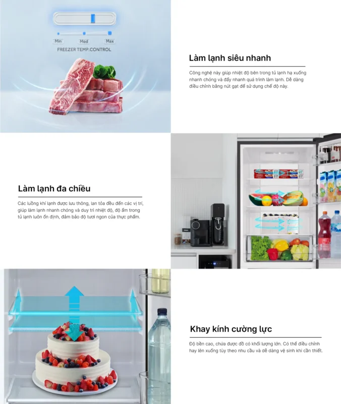 Luồng khí lạnh đa chiều được phân bổ đồng đều, đảm bảo thực phẩm ở mọi vị trí đều được làm lạnh hiệu quả. Chế độ làm lạnh nhanh hỗ trợ bảo quản tốt khi cho nhiều thực phẩm mới vào tủ. Công nghệ DEO Fresh với ion bạc Ag+ giúp diệt khuẩn, khử mùi, giữ không gian tủ luôn sạch sẽ và an toàn. - Thiết kế ngăn đá dưới, khay kính cường lực bền bỉ