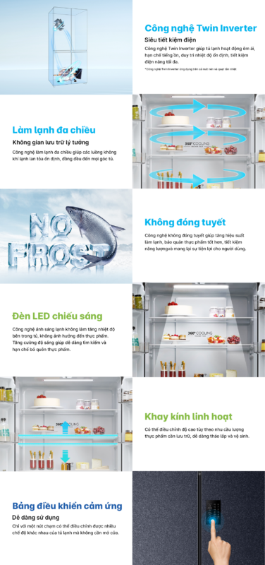 Công nghệ làm lạnh gián tiếp hạn chế đóng tuyết, giữ nguyên cấu trúc thực phẩm. Kết hợp cùng hệ thống làm lạnh đa chiều giúp luồng khí lạnh lan tỏa đều khắp các ngăn. Thực phẩm được làm lạnh nhanh và bảo quản đồng đều ở mọi vị trí.