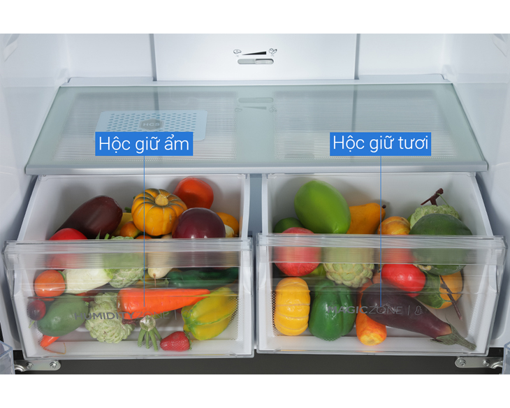 Ngăn rau củ được trang bị công nghệ HCS giúp duy trì độ ẩm lý tưởng lên đến 90%. Nhờ đó, rau củ và trái cây luôn tươi ngon, mọng nước và hạn chế héo úa. Đây là giải pháp bảo quản thực phẩm lành mạnh, an toàn cho sức khỏe gia đình.