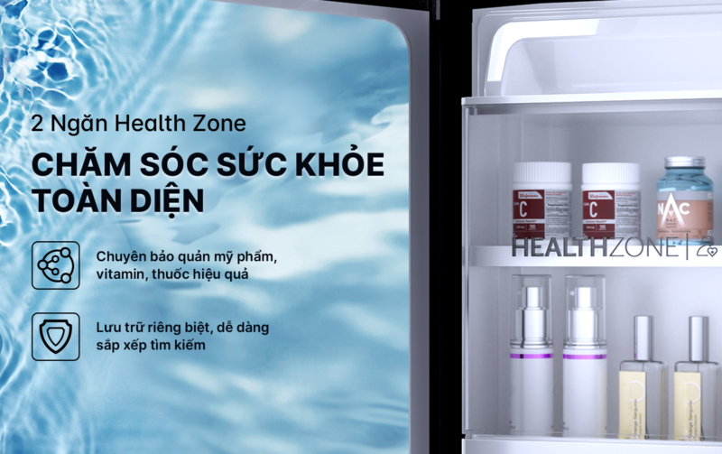 Health Zone được thiết kế chuyên biệt để bảo quản mỹ phẩm, vitamin và thuốc ở điều kiện ổn định. Việc tách biệt với thực phẩm thông thường giúp đảm bảo vệ sinh và chất lượng sản phẩm. Đây là điểm nổi bật phù hợp với gia đình quan tâm đến chăm sóc sức khỏe và làm đẹp.