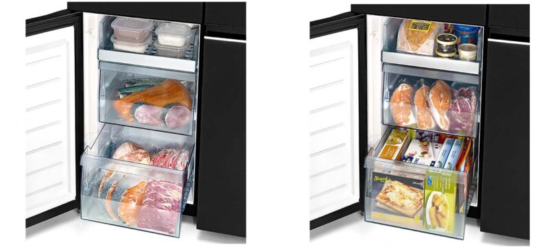 Ngăn rau quả được duy trì độ ẩm khoảng 90% nhờ làm mát gián tiếp, giúp rau củ luôn tươi ngon lâu dài. Ngăn chuyển đổi đa năng Selectable Zone cho phép tùy chỉnh nhiệt độ từ đông mềm -3°C đến đông lạnh -18 ~ -20°C, phù hợp với nhiều loại thực phẩm khác nhau, sẵn sàng nấu ngay mà không cần rã đông.
