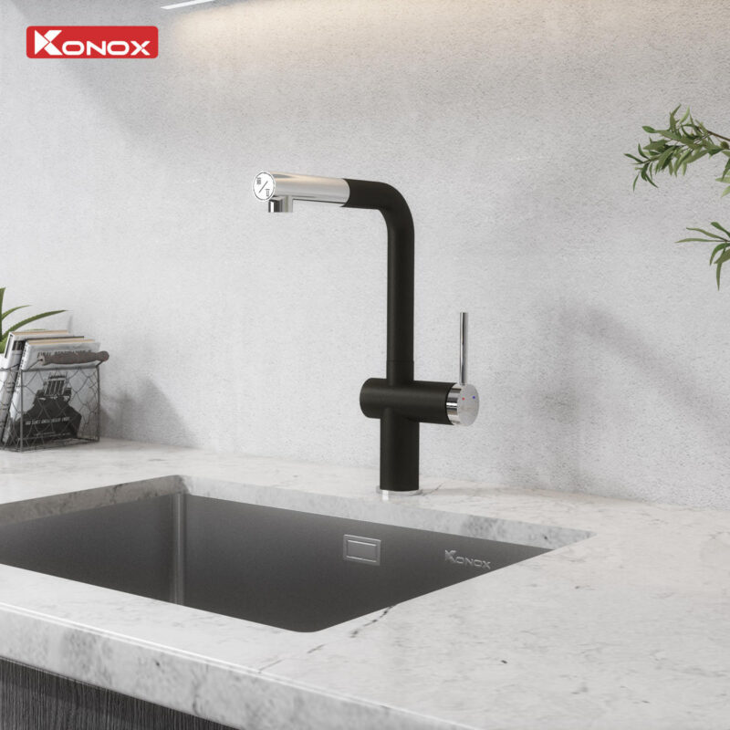 - Konox Stream Smart Black sở hữu đầu vòi rút dây tiện lợi, mở rộng phạm vi thao tác lên đến 76 cm, đáp ứng tốt nhu cầu vệ sinh chậu rửa và sử dụng với chậu lớn. Thân vòi xoay 360 độ cho khả năng tiếp cận linh hoạt, giúp các thao tác làm bếp trở nên thuận tiện và nhanh chóng hơn.
