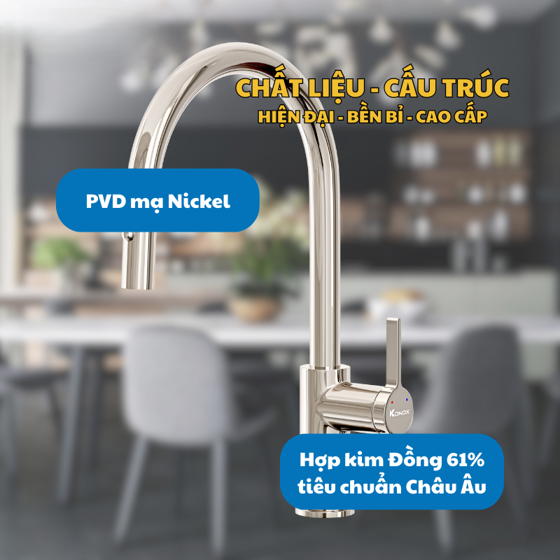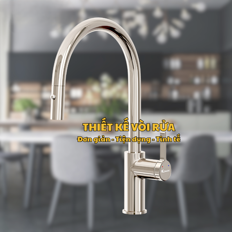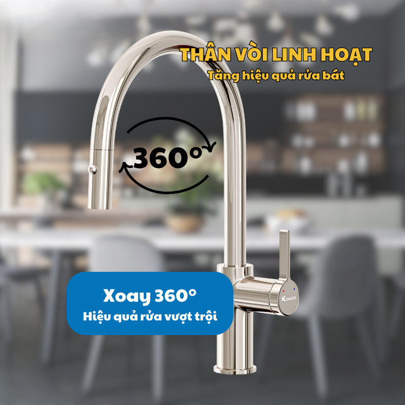 - Vòi rửa bát KONOX ALTO NICKEL là lựa chọn hoàn hảo cho những không gian bếp hiện đại, kết hợp hài hòa giữa tính thẩm mỹ, công năng và độ bền vượt trội. Sản phẩm sở hữu thiết kế dây rút 2 đường nước nóng – lạnh, thân vòi xoay 360° và đầu vòi kéo dài tới 76cm, mang lại sự linh hoạt tối đa cho mọi thao tác rửa, từ xử lý thực phẩm đến vệ sinh bồn rửa.