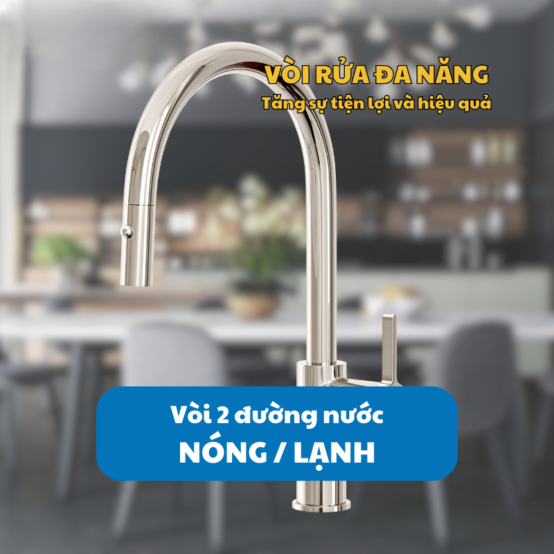 Sản phẩm hỗ trợ hai đường nước nóng và lạnh riêng biệt, kết hợp cơ chế dây rút linh hoạt, giúp người dùng dễ dàng điều chỉnh nhiệt độ và hướng xả nước cho nhiều tác vụ khác nhau, từ rửa bát, sơ chế thực phẩm đến vệ sinh bồn rửa.