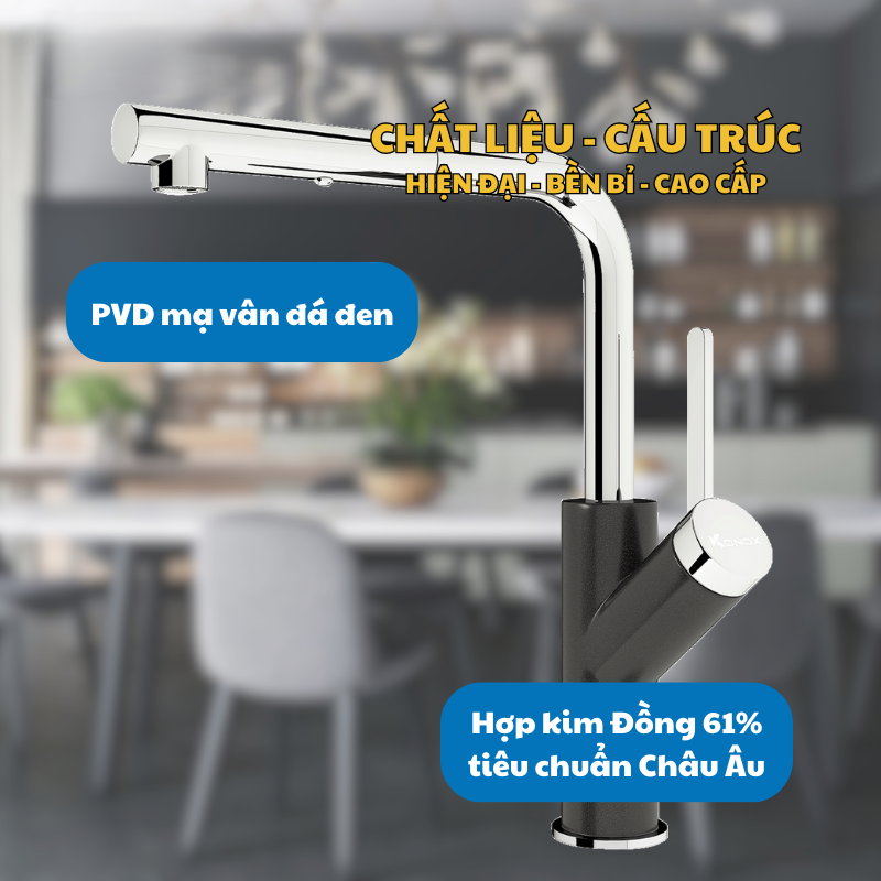 - Vòi rửa bát Konox Artan Black là một sản phẩm cao cấp trong phân khúc thiết bị nhà bếp hiện đại, mang đến sự kết hợp hài hòa giữa thiết kế thẩm mỹ, chất liệu an toàn và công nghệ tiên tiến. Với lớp mạ PVD màu đen vân đá độc đáo, sản phẩm không chỉ gây ấn tượng về mặt thị giác mà còn dễ dàng hòa hợp với nhiều phong cách nội thất bếp từ hiện đại, tối giản cho đến công nghiệp mạnh mẽ.