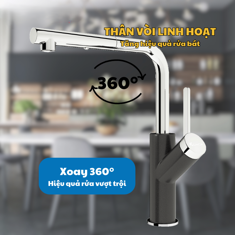 Thân vòi có khả năng xoay tròn 360 độ, giúp người dùng dễ dàng điều chỉnh hướng nước trong quá trình sử dụng, đặc biệt hữu ích khi rửa các loại nồi chảo lớn hoặc khi sử dụng cả hai hố chậu.