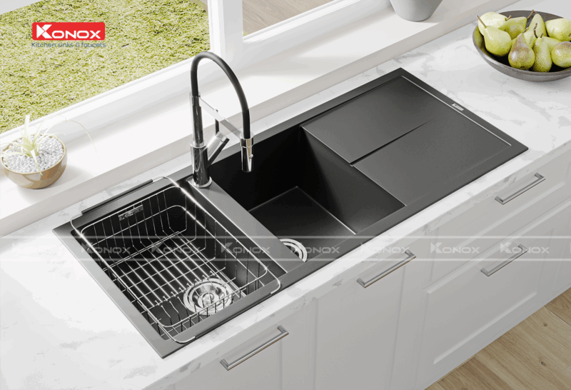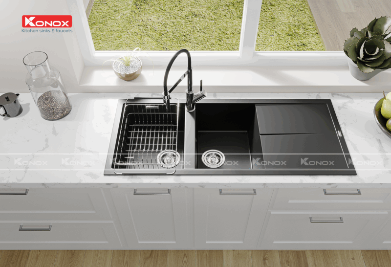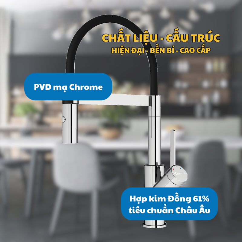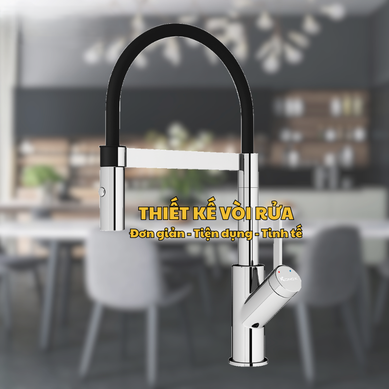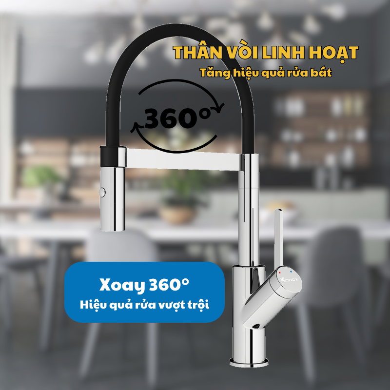 - Điểm nổi bật của Konox Bian nằm ở thân vòi mềm kết hợp khả năng xoay 360 độ, giúp mở rộng tối đa phạm vi thao tác, thuận tiện khi rửa vật dụng lớn hoặc làm sạch chậu rửa. Thiết kế thông minh này không chỉ nâng cao trải nghiệm người dùng mà còn giúp tiết kiệm thời gian và công sức trong quá trình nấu nướng, dọn dẹp.