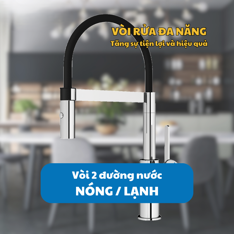 - Chức năng: Nóng lạnh + Thân vòi mềm + Đầu vòi khớp xoay + 2 chức năng Sprayer (Dòng chảy tạo bọt + dòng chảy phun mưa) + Xoay 360 độ