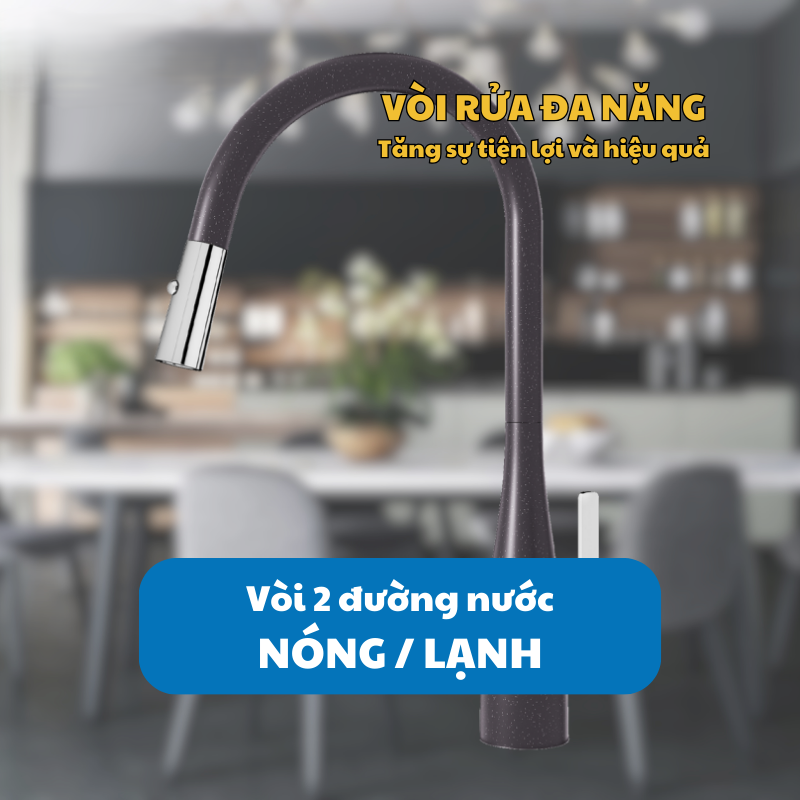 - Chức năng: Nóng lạnh + Rút dây + Đầu vòi khớp xoay + 2 chức năng Sprayer (Dòng chảy tạo bọt + dòng chảy phun mưa) + Xoay 360 độ
