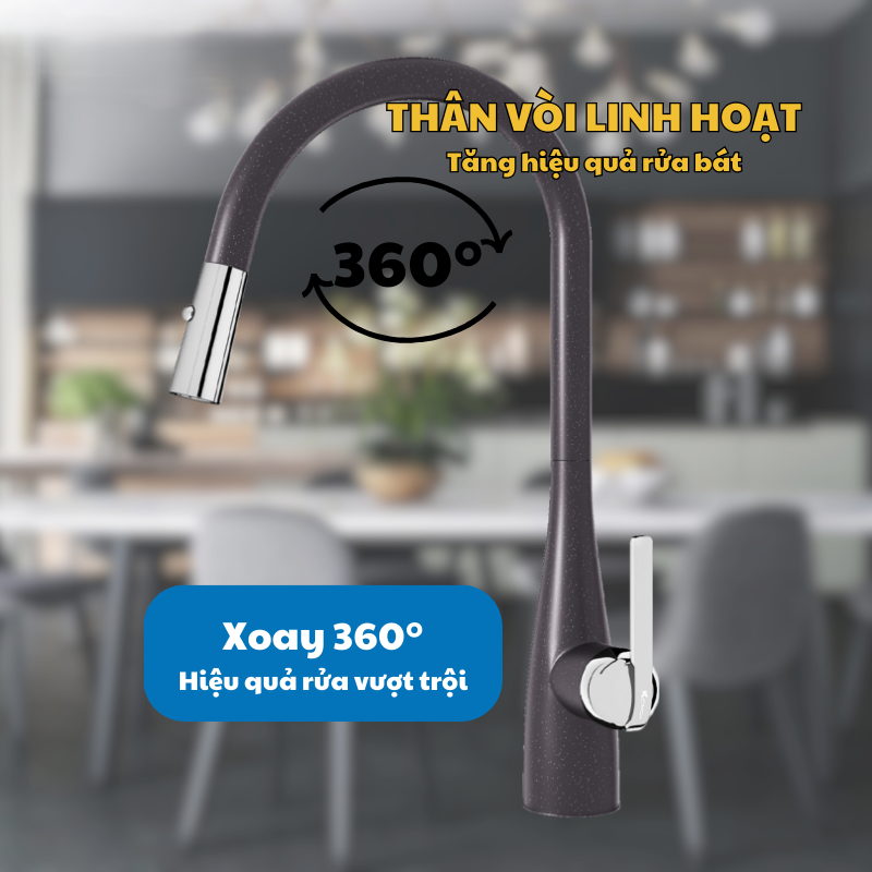 Vòi được trang bị thân xoay 360 độ, cho phép người dùng dễ dàng điều chỉnh hướng nước, thuận tiện khi sử dụng cho chậu đơn hoặc chậu đôi. Bên cạnh đó, đầu vòi kéo dây có thể mở rộng phạm vi làm việc lên đến 76cm, hỗ trợ thao tác làm bếp linh hoạt hơn, kể cả khi rửa thực phẩm hay vệ sinh khu vực chậu.
