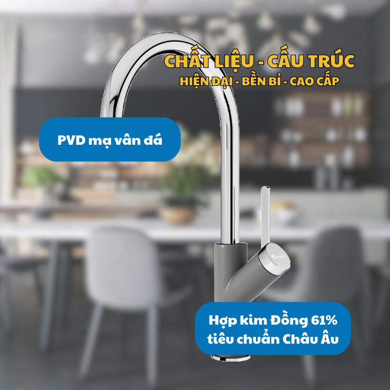 - Vòi rửa bát KONOX MODO GREY là sản phẩm cao cấp được thiết kế theo phong cách hiện đại, mang vẻ đẹp tinh tế và sang trọng, phù hợp với nhiều phong cách bếp từ cổ điển đến tối giản. Với chất liệu inox 304 cao cấp, bề mặt phủ PVD màu xám bền màu, sản phẩm không chỉ đảm bảo độ bền vượt trội, chống ăn mòn và chịu lực tốt mà còn an toàn cho sức khỏe người dùng.