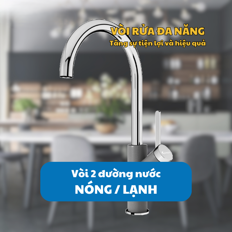 Vòi rửa bát Konox MODO GREY được tích hợp 2 đường cấp nước nóng và lạnh, giúp người dùng dễ dàng điều chỉnh nhiệt độ chỉ với thao tác đơn giản. Điều này đặc biệt tiện lợi cho các nhu cầu khác nhau như rửa rau củ quả bằng nước mát, làm sạch vết bẩn dầu mỡ bằng nước ấm, hay vệ sinh vật dụng bếp với nhiệt độ phù hợp, mang lại trải nghiệm sử dụng tối ưu quanh năm.